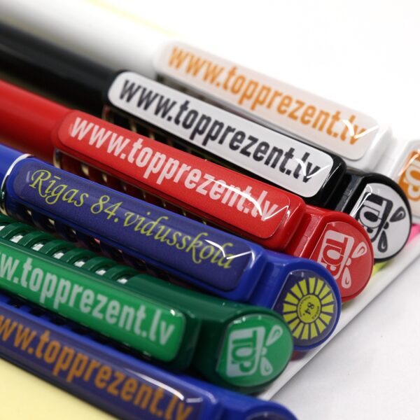 Pildspalvas, nozīmītes, ūdens pudeles, atslēgu piekariņi un citas preces